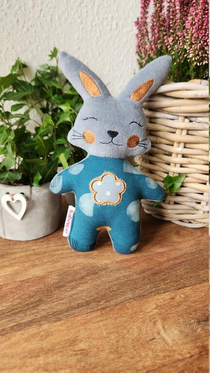 Dejlig blød kaninbamse fra Babyløjer, i fin natdragt med applikeret blomst.
