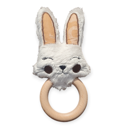 Blød rangle med bjælde på 7 cm træring i naturtræ.