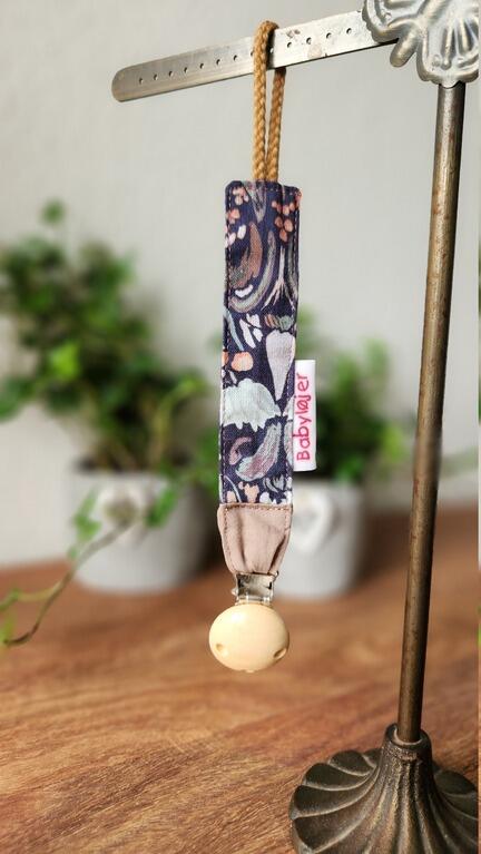 Fin suttesnor fra Babyløjer med clips i naturtræ, lige til at hæfte på tøjet, så der altid er styr på sutten.