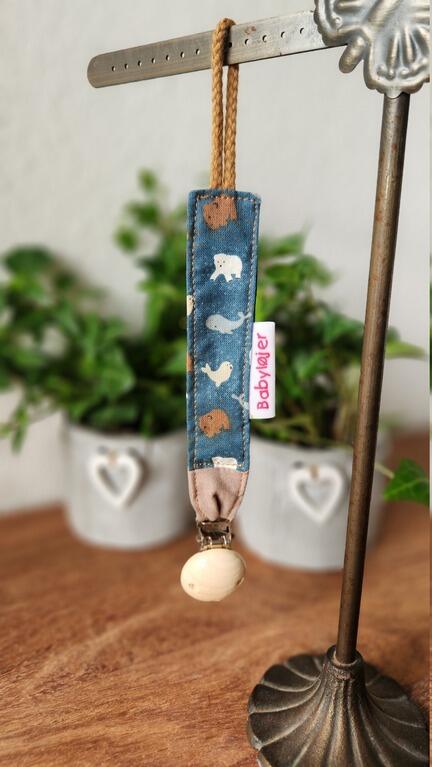Fin suttesnor fra Babyløjer med clips i naturtræ, lige til at hæfte på tøjet, så der altid er styr på sutten.